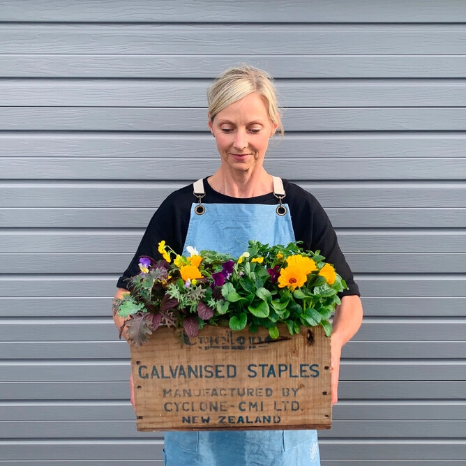 I bought some salad green seedlings, added some edible flowers and herbs that I already had growing in the garden and voilā - box o' rainbow salad at your fingertips.